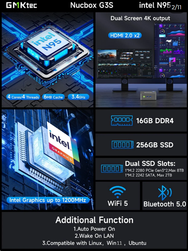 - Crisp Dual 4K Display Support: Equipped with dual HDMI 2.0 ports, the G3S supports simultaneous dual 4K (60Hz) display output. This makes it an ideal solution for multi-monitor setups, digital signage, retail kiosks, or immersive home entertainment.