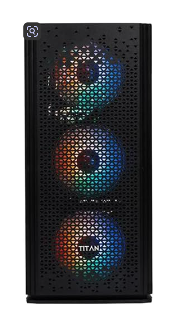 - Case: Housed in a stylish Titan RGB gaming case featuring multiple cooling fans for airflow and customizable lighting effects, controlled by a remote.
