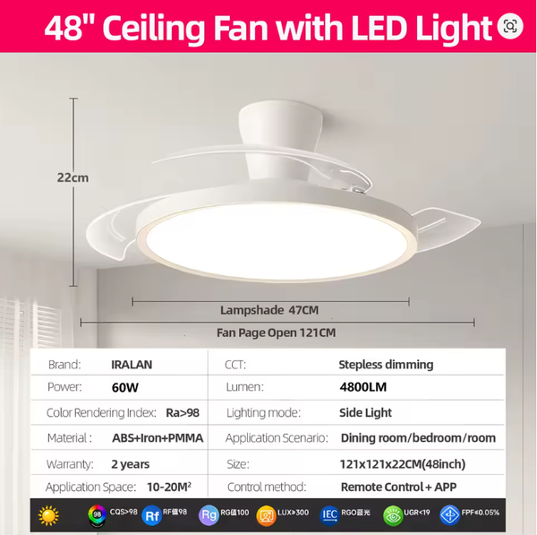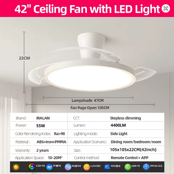 IRALAN Ceiling Lights with Fan Smart Retractable Fan Blade Home Electric Fan Dimmable with Remote Control Led Living Room Light